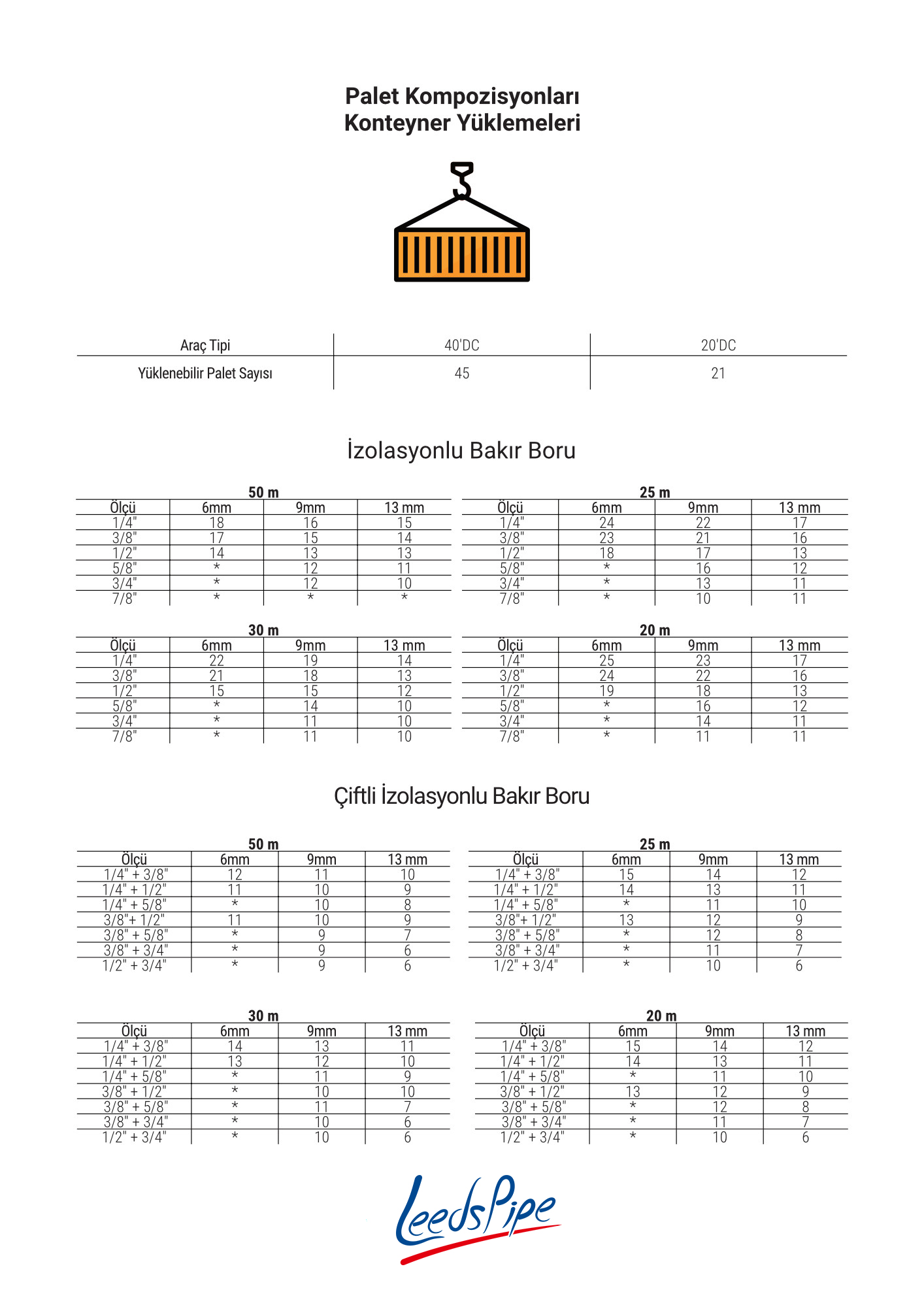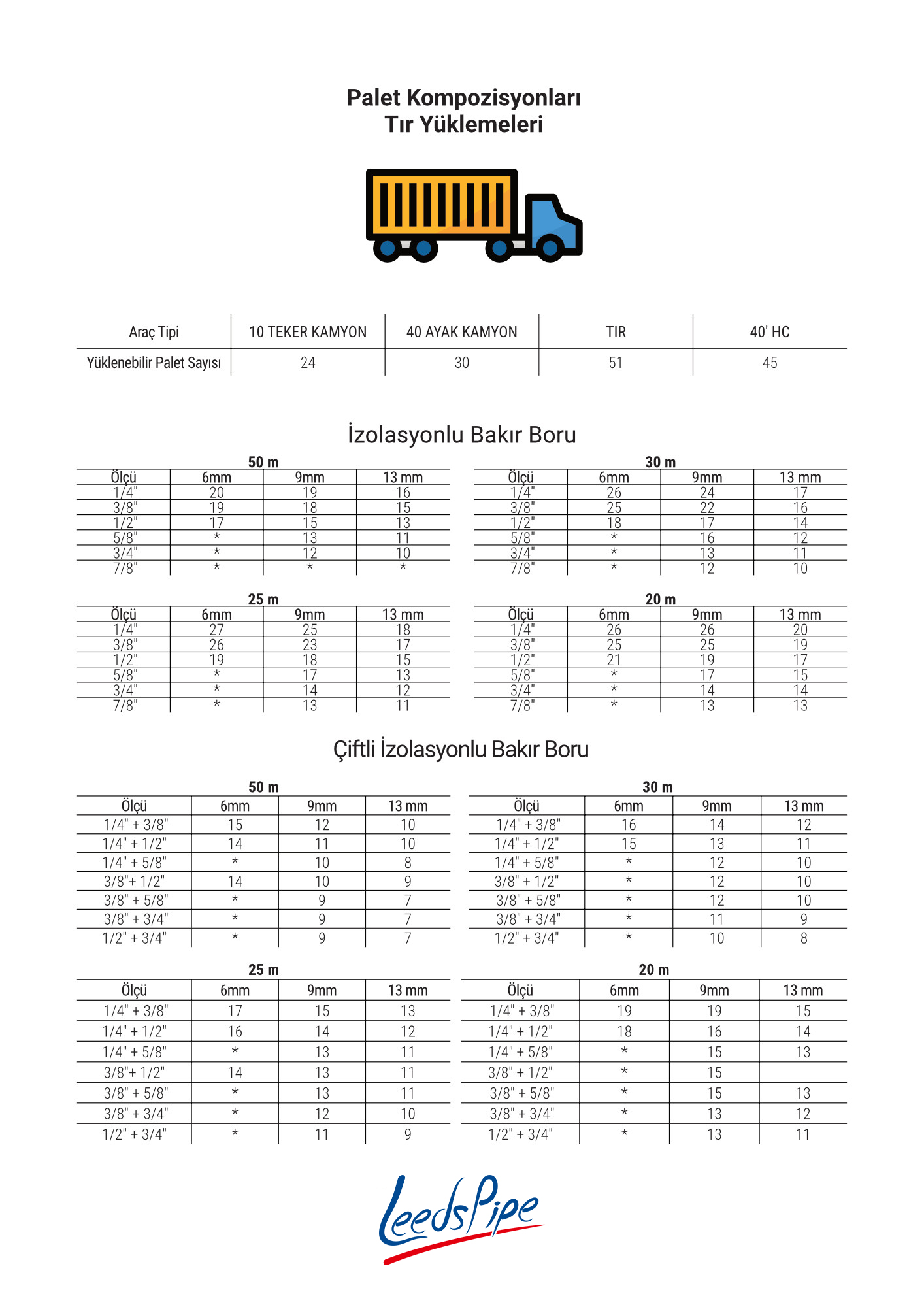 | Boru Çapı ( inç ) | 1/4 | 3/8 | 1/2 | 5/8 | 3/4 | 7/8 | |